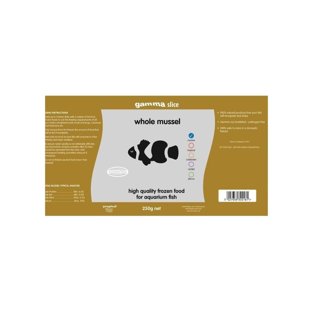 O Whole Mussel Gamma da TMC (Tropical Marine Centre) é um alimento natural congelado composto por mexilhões inteiros (Mytilus spp.), ideal para a alimentação de peixes marinhos e de água doce, bem como de invertebrados como anémonas e corais carnívoros.
